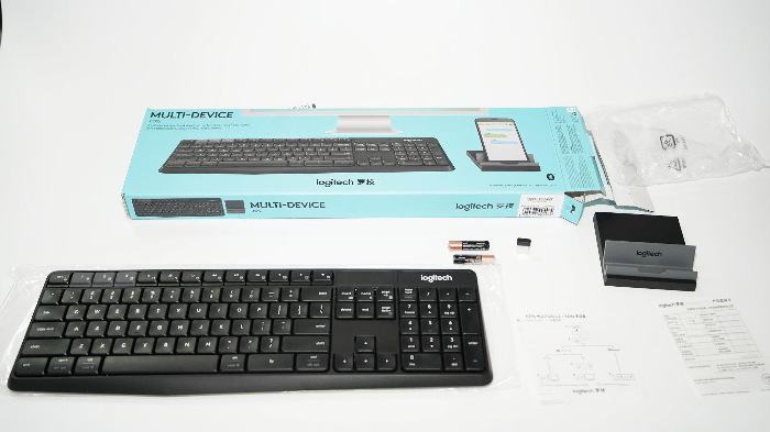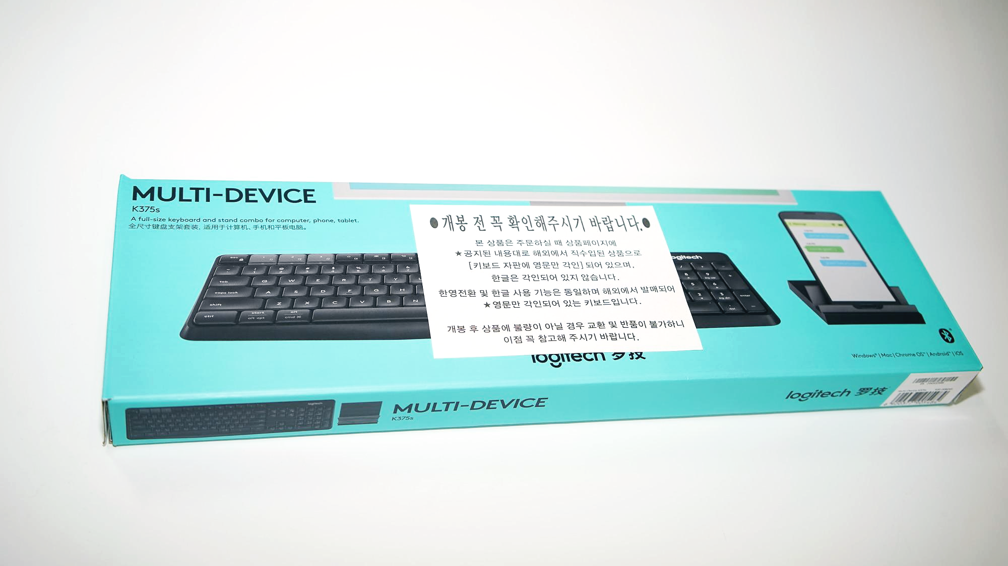 구성품은 키보드, AAA 건전지 2개, 핸드폰 거치대, 그리고 가장 궁금한 Unifying 수신기, 설명서 입니다. 겉봉에 붙여둔 경고(?)대로 한글 각인이 없습니다 ㅜ 더더욱 키보드를 안 보게 되겠네요.