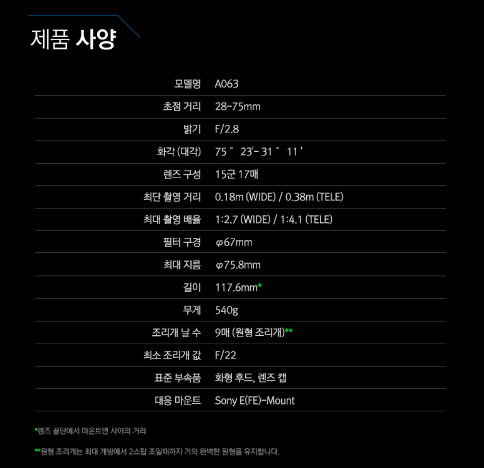최대 광각에서 0.18m, 최대 망원에서 0.38m 정도면 일상 생활에서 피사체에 들이대고 찍기에 부족함이 없어 보입니다. 음식 사진 혹은 제품 촬영에서도 유용하게 쓰일것 같습니다.